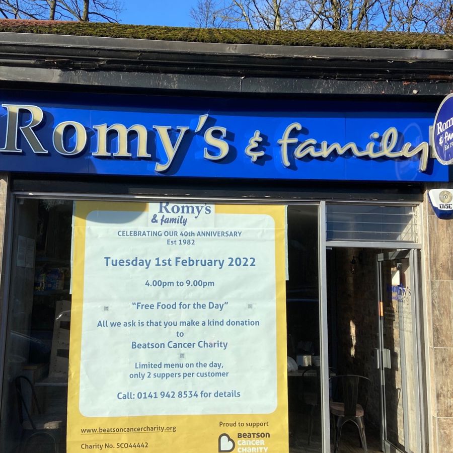 Romy’s fish and chip shop in Bearsden is giving away free suppers today in aid of Beatson Cancer Charity.